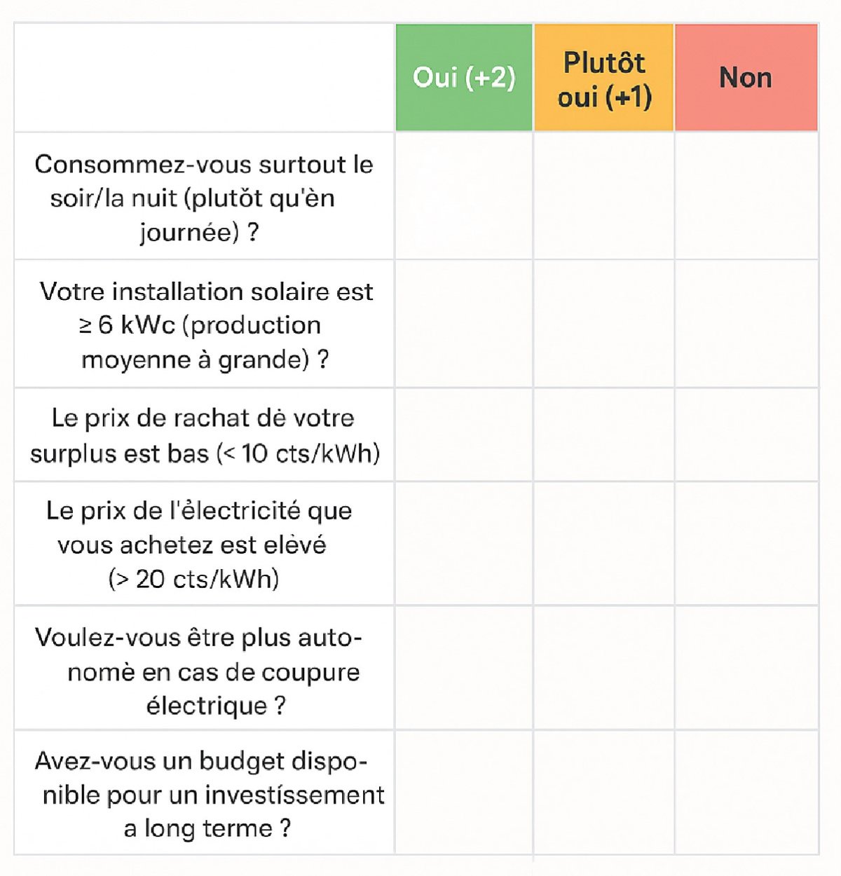- 10 points ou plus → La batterie est très probablement une bonne option pour vous.